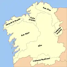 Geográficamente, una de las peculiaridades de Galicia es la presencia de las rías, indentaciones en la costa en las que el mar anegó valles fluviales por descenso del nivel terrestre (ascenso relativo del nivel marino). Las rías están tradicionalmente divididas en Rías Altas y Rías Bajas, según su posición respecto al cabo Finisterre como punto más occidental de Galicia. La leyenda, menos prosaica que la ciencia, nos dice que las Rías Bajas se formaron cuando Dios, en el séptimo día tras la Creación, se sentó a descansar y a disfrutar de su obra en el lugar más bonito apoyando su mano de modo que los dedos dieron origen a las cinco rías entre Corcubión (dedo pulgar) y Vigo (dedo meñique).
