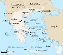 Grecia (en griego Ελλάδα) es un estado de Europa meridional, miembro de la Unión Europea (UE) situado en el extremo sur de la península balcánica en el litoral del mar Mediterráneo. Limita con el Mar Egeo, el Jónico y el Mediterráneo, entre Albania y Turquía. Grecia tiene frontera por tierra con Albania, Macedonia del Norte, Bulgaria y Turquía. Por mar hace frontera con Italia, Turquía y Albania.