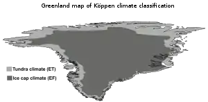 Groenlandia tiene un clima de tundra cerca de las costas y un clima gélido en el interior. Los veranos son frescos y los inviernos largos y moderadamente fríos. Debido a la influencia de la corriente del Golfo, las temperaturas invernales son suaves para la latitud. En Nuuk, la capital, las medias invernales de temperatura son solo de -9.oC.[1] En comparación, la media invernal para Iqaluit, la capital de Nunavut, en Canadá, es de unos -27.oC. Por el contrario, en verano, las temperaturas son muy suaves, , con una media en torno a los 10.oC, insuficientes para mantener una vegetación arbórea.