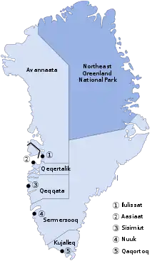 Groenlandia tiene 18 ciudades - asentamientos con más de 500 habitantes. Nuuk es la ciudad más grande - y la capital - con aproximadamente un tercio de la población urbana del país. Sisimiut con aproximadamente 6.000 habitantes es la segunda ciudad más grande, mientras que Ilulissat es el número tres con 5.000 habitantes.