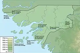 • Parque nacional de las Islas Orango, 1.582 km², en las islas Bijagós, un archipiélago formado por 18 islas principales y docenas de islas más pequeñas. El parque comprende cinco islas deshabitadas, Orango, Orangozinho, Meneque, Canogo e Imbone, y 3 islotes, Adonga, Canoupa y Anhatibe, que no tienen presencia humana permanente. El interior está dominado por palma aceitera, en la costa hay sabana y arenales. Hay hipopótamos, cocodrilos del NIlo y cocodrilos enanos, cinco especies de tortugas, entre ellas, la tortuga olivácea, la tortuga boba y la tortuga laúd. También hay delfines, antílopes y cercopitecos verdes.[7]