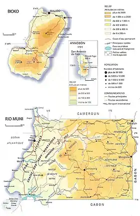 La isla más importante es Bioko (2017 km²), y está situada al norte de la parte continental, a 40 kilómetros de la costa de Camerún en el fondo del golfo de Biafra, una sección del golfo de Guinea. La isla, de origen volcánico, es montañosa y muy boscosa, con una costa escarpada y rocosa (de 195 km) en las que cuando sube la marea oculta sus playas. Excelentes puertos en Malabo y Luba. Su altura máxima es el pico Basilé (3007 metros), anteriormente conocido como Pico de Santa Isabel. La isla cuenta con fértiles suelos volcánicos (en los que se cultiva cacao) y diversos ríos; los lagos se encuentran en las montañas.