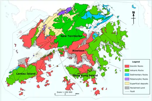 La geología de Hong Kong está dominada por rocas ìgneas (incluyendo rocas graníticas y rocas volcánicas) formadas durante un periodo de erupción volcánico importante en la era Mesozoica. Compuesta por 85 % de la superficie terrestre de Hong Kong y el restante 15 % mayoritariamente por rocas sedimentarias localizdas en el nordeste Nuevos Territorios. Hay también un porcentaje muy pequeño (menos de 1 %) de rocas metamórficas en Nuevos Territorios. Estas están formados por la deformación de rocas sedimentarias preexistentes que cambiaron sus ensamblajes minerales (metamorfismo).[4]