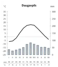 La temperatura máxima de Letonia es de 33 °C grados y la mínima de -43,1 °C grados. Riga conoce temperaturas de -10 °C a -4 °C en enero y entre 11 °C y 22 °C en el mes de julio. Las temperaturas medias en el invierno son razonablemente suaves que van en enero de los -2,8 °C en Liepaja, en la costa occidental, a los -6,6 °C en la ciudad suroriental de Daugavpils. Las temperaturas en julio van de los 16,7 °C en Liepaja a los 17,6 °C en Daugavpils.
