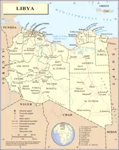 Libia es un país perteneciente al África mediterránea. Libia limita con el Mar Mediterráneo al norte, al oeste con Túnez y Argelia, al suroeste con Níger, al sur con Chad, al sureste con Sudán y al este con Egipto.