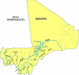 - el río Níger, que recorre sobre el país 1700 km. Poco antes del gran arco que cambiará su curso hacia el sur, en el centro del país, después de recibir por el lado oriental al río Bani, que confluye cerca de la ciudad de Mopti, se encuentra el delta interior del Níger, entre Tombuctú y Léré, una vasta zona inundada después de la estación de las lluvias, en otoño, con un máximo de 41.000 km². Tras la crecida, la región queda salpicada de lagos, entre ellos, los lagos Débo, Figuibine, Kabara, Tanda, y así hasta diecisiete lagos destacables en época de crecida. La cuenca del río Níger cubre 578.850 km² en Mali, el 25,5% del total de su cuenca, el 46,7% de la superficie del país. Las precipitaciones oscilan en la cuenca entre los 45 y los 1500 mm, con una media de 440 mm.[20]