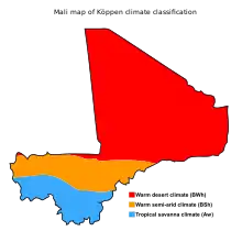 Mali puede dividirse en cuatro zonas ecológicas en función del clima, el suelo y la topografía: la estepa sahariana, la estepa saheliana, la zona sudanesa y la zona sudano-guineana.[26]