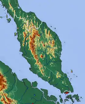 Está dividida de norte a sur por una larga cadena montañosa, las montañas Titiwangsa, de 480 km de longitud, que culminan en los 2.183 m del monte Korbu y que son la continuación de los montes Tenasserim, que separan Birmania de Tailandia más al norte. La parte oriental de esta cadena, formada por sierras paralelas, se conoce como Bintang, y culmina en el monte Bintang, de 1.862 m. Estas montañas dividen la península en costa oriental y occidental.[1]