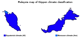 El clima de Malasia es ecuatorial, cálido, húmedo y lluvioso todo el año. Las temperaturas son elevadas y estables, con un ligero descenso entre noviembre y enero, con máximas de 29-30.oC, aunque cuando hace más calor, entre marzo y agosto, apenas suben a 32-33.oC. Por otro lado, es difícil encontrar un lugar donde caigan menos de 2000 mm anuales, y un mes en que caigan menos de 100 mm. Malasia está expuesta al monzón, que puede provocar lluvias muy intensas en las zonas expuestas a los vientos que prevalecen del nordeste entre mediados de octubre y enero (afectando sobre todo a la costa oriental y el nordeste de Borneo) y del sudoeste entre junio y septiembre, de forma más débil. Las lluvias suelen ser tormentosas y por la tarde.[13]