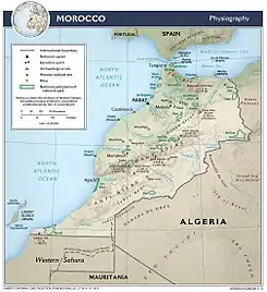 Marruecos es un país africano que limita por el norte con el Mar Mediterráneo, con España en sus fronteras terrestres de Ceuta y Melilla y el océano Atlántico, unidos por el estrecho de Gibraltar. Al sur hace frontera con Mauritania. Al este y sureste hace frontera con Argelia y al oeste con el océano Atlántico.