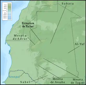 Hacia el oeste, entre el océano y las mesetas, alternan zonas de llanuras pedregosas, reg, con zonas de dunas, erg. Las dunas son movedizas y suelen aumentar en tamaño hacia el norte. La llanura costera tiene menos de 45 m de altitud, mientras las mesetas oscilan entre 180 y 230 m, aunque hacia el interior se elevan gradualmente mediante escarpes que más bien son cuestas, aunque también se encuentran inselberg, entre los que destaca el monte Ijill o Kediet Ijill, de 915 m, un enorme bloque de hematita, mineral de hierro.
