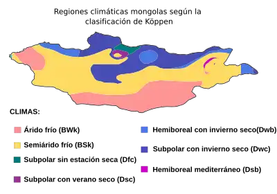 Mongolia es alta, fría y seca. Tiene un clima continental extremo, con inviernos largos y fríos y veranos cortos, durante los cuales se concentra la mayoría de las precipitaciones. El país tiene un promedio de 257 días despejados al año, y suele encontrarse en el centro de una región de alta presión atmosférica. Las lluvias son más abundantes en el norte, que tiene un promedio de 200 a 350 milímetros por año, y lo son menos en el sur, que recibe de 100 a 200 milímetros. En el extremo sur del país se halla el desierto de Gobi, en algunas de cuyas regiones nunca llueve.