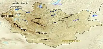 Mongolia es una república situada entre Rusia y China, con una extensión en torno a 1.565.000 km², poco más de tres veces la extensión de España, una forma oval con 2392 km de oeste a este y 782 km de norte a sur, y una población estimada en 2020 de 3.278.000 personas, con una densidad de 2 hab/km², una de las más bajas del mundo.[1] La mayor parte del territorio de Mongolia está compuesto por mesetas, rodeadas de cadenas montañosas en el norte y en el oeste. La altitud media es de unos 1580 m. Los montes Altái se encuentran en el oeste, del que forma parte el pico Juiten, de 4373 m, el punto más elevado del país. Desde aquí, la altitud disminuye progresivamente hacia el sur y el este. El punto más bajo del país, situado en el sur, tiene una altitud superior a los 500 m. La taiga cubre áreas extensas del norte del país. El desierto de Gobi cubre una amplia extensión del sur y del este. El resto del país se encuentra cubierto por estepas.