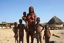 La mayoría de namibios son de origen lingüístico bantú, sobre todo de la etnia ovambo, que forman más de la mitad de la población (50-60%) y viven preferentemente en el norte del país. Siguen los kavango (9%), que viven en el nordeste, en la frontera con Angola, los herero (7-10%, unos 280.000)), los damara (7%), los nama (5%), los lozi de la franja de Caprivi (4%), los san (3%) y los tsuana (0,5%). Los himba (unos 50.000 entre Namibia y Angola), que viven en el noroeste y conservan su modo de vida tradicional, se separaron de los herero hace unos 200 años, comparten el idioma herero, pero su modo de vida y cultura son muy distintos.