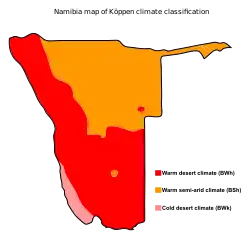 Namibia, cortada por el trópico de Capricornio, tiene clima subtropical, desértico a lo largo de la costa y en el sur, y árido, con una época de lluvias entre noviembre y marzo, en el centro-norte y en el nordeste.