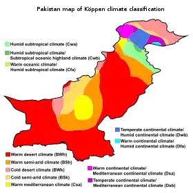 Gran parte de Pakistán tiene clima tropical o subtropical, semiárido o desértico, pero en el norte, en las montañas, el clima es húmedo y frío, y en los picos más altos, es muy frío. El periodo más fresco y lluvioso se da entre el otoño y principios de primavera, cuando sucesivos frentes alcanzan el país. En plena primavera, se producen tormentas y vientos fuertes por el choque de las masas de aire; a principios de verano, antes de los monzones, el calor es extremo, y de julio a mediados de septiembre, llegan los monzones de la India, aunque no alcanzan a todo el país, y se quedan en la parte oriental. Además, los monzones son irregulares, hay años que provocan inundaciones y otros que no llegan. Las lluvias más intensas se dan en el norte, en el curso alto del Indo, y las inundaciones se producen en las zonas bajas. Los años de La Niña, llueve más de lo normal, y los años de El Niño, menos.[12]