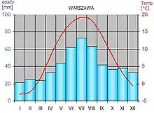 La primavera llega lentamente en marzo o abril, trayendo principalmente días soleados después de un período de alterar condiciones invernales y primaverales. Los veranos, que se extiende desde junio hasta agosto, es generalmente menos húmedo que el invierno. Son suaves, con temperaturas que varían entre los 15º y 25º. Los chubascos y las tormentas alternan con tiempo seco soleado que es generado cuando prevalecen los vientos del sur. La región más cálida es Baja Silesia y Pequeña Polonia. A principios del otoño es generalmente soleado y cálido antes de un período de tiempo lluvioso y más frío en noviembre comienza la transición al invierno. En el invierno, que puede durar de uno a tres meses, trayendo frecuentes tormentas de nieve pero una precipitación total relativamente bajo; las temperaturas descienden por debajo de 0 °C. Las temperaturas extremas registradas en el territorio polaco son 40,2 °C (Prószków cerca de Opole, 29 de julio de 1921), -41,0 °C (Siedlce, el 11 de enero de 1940). La amplitud térmica anual se acentúa conforme se avanza hacia el este, donde pueden superar los 20 °C de diferencia. En los Cárpatos y los Sudetes el clima es de montaña.