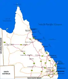 La Pacific Highway une Brisbane y Sídney a lo largo de la costa, mientras que la New England Highway une las ciudades tierra adentro. La Newell Highway conecta Goondiwindi con los estados del sur a través del centro de Nueva Gales del Sur. La Bruce Highway, que discurre a lo largo de la costa desde Brisbane a Townsville, tiene secciones cerca de Gympie que se describieron en un informe de 2006 como una de las peores autopistas nacionales de Australia.[21]