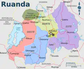La divisoria Congo-Nilo entre las cuencas de los ríos Nilo y Congo discurre de norte a sur a través de Ruanda, con un 80 por ciento del país drenando en el Nilo y un 20 por ciento en el Congo a través del río Ruzizi.[1]