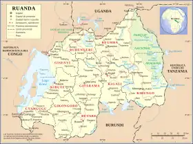 - Parque nacional de Akagera, creado en 1934, 1200 km², así llamado por el río Kagera que marca la frontera oriental de Ruanda con Tanzania. El parque ocupa la parte central de la zona fronteriza desde el lago Ihema hacia el norte. La cuenca del río, por su lado izquierdo, está formada por una serie de humedales y sabana con numerosos lagos, entre ellos, los lagos Kivumba, Hago, Mihindi, con la llamada Playa de los hipopótamos, y Rwanyakizinga. Al norte, al otro lado de la frontera, la protección continúa en la Reserva de caza de Ibanda, en Tanzania. Al sur, también en Tanzania, se encuentra la Reserva de caza de Kimisi. El parque tiene una abundante fauna entre la que se encuentran los cinco grandes de África, además de jirafas, hienas, leopardos, cocodrilos, etc., y más de 500 especies de aves.[8]