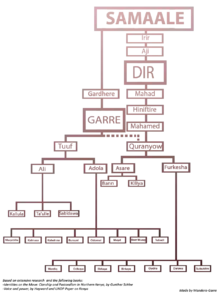 El 85% de los habitantes de Somalia pertenecen a la etnia somalí, que se extiende también por Yibuti, Etiopía, Yemen, y Kenia.[22] Los somalíes son de 15 a 17 millones, aparecen en la misma región hace miles de años, hablan el idioma somalí, viven en pueblos pequeños y son musulmanes suníes. Están divididos en clanes, a los que sus miembros sienten más pertenencia que a la etnia. La historia de Somalia está definida por las relaciones de estos clanes, aunque muchos están dirigidos por señores de la guerra que se han enfrentado con frecuencia. En al año 2999, una serie de señores de la guerra se alió para formar un partido llamado Transitional National Government, Gobierno Nacional de Transición, aunque muchos quedaron fuera, y los enfrentamientos se producen también con las demás tribus.[23] Los clanes más importantes se distinguen también por considerarse clanes nobles y por su estilo de vida nómada, en contraste con los grupos sab, sedentarios, que son las castas de pastores, agricultores y artesanos.[24]