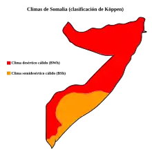 El clima es árido en el nordeste y centro, y semiárido en el noroeste y el sur. Las precipitaciones propician el paisaje desértico o semidesértico, y en las áreas húmedas aparece la sabana. En las zonas más secas del norte no se superan los 50 mm, y en el nordeste, las lluvias no superan los 200 mm, mientras que en el noroeste, a los pies del macizo etíope y por la altitud, las lluvias alcanzan los 500 mm (en Hargeisa caen 413 mm en 44 días, con una sequedad casi total entre noviembre y febrero), igual que en el sudoeste (en Baidoa caen 572 mm en 47 días sobre todo entre abril y mayo y octubre y noviembre).[10]