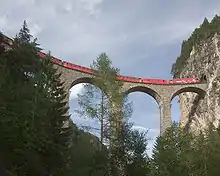 - Viaducto de Landwasser, dedicado al transporte ferroviario, con una longitud de 136 m y una altura de 65 m, construido entre 1901 y 1903, que recibió un homenaje por medio de un sello de correos suizo del año 1949.