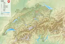 Se trata de un país eminentemente montañoso cuyas cordilleras se alinean en sentido suroeste-noreste. Está bordeado al sur por la cadena montañosa de los Alpes y al oeste por la del Jura, y cuenta con numerosas cimas por encima de los 4000 m de altitud. Esto determina que Suiza esté conformada por tres grandes regiones naturales: la cordillera de los Alpes en la mitad suroriental del país, la cordillera del Jura en el noroeste y la meseta suiza o corredor de Mittelland (Tierra del Medio), entre ambas. Cabe añadir las zonas de Basilea (situada más allá del Jura en la fosa tectónica de la fosa renana) y el distrito de Mendrisio, perteneciente a la cuenca del río Po.
