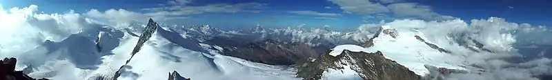 - Alpes peninos, cuya máxima elevación es la punta Dufour (4636 m), en el macizo de Monte Rosa. El profundo valle del Ródano separa y permite distinguir la región del Valais.