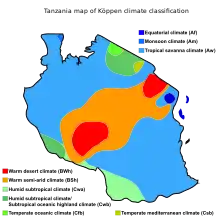 El país se divide en cuatro zonas pluviométricas. En el norte y el este, excepto el lago Victoria, hay dos temporadas lluviosas, una gran estación de las lluvias de principios de marzo a principios de mayo (masika), con un pico en abril, y una corta, de finales de octubre a mediados de diciembre, donde las precipitaciones son menos abundantes (vuli). La gran temporada seca se extiende de mayo a octubre, y la pequeña temporada seca, cálida y soleada por debajo de 1000 m, de enero a marzo (kiangazi). En el lejano noroeste, las dos estaciones lluviosas están conectadas, llueve incluso en enero y febrero, algo que pasa también en las laderas meridionales del monte Kilimanjaro.[3]