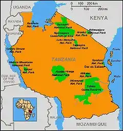 En Tanzania hay 830 áreas protegidas, de las cuales 17 son parques nacionales, 19 son reservas de caza, 6 son reservas de la naturaleza, 4 son áreas de conservación, 2 son parques marinos, 2 son reservas marinas, 1 es un área de gestión de la vida salvaje, 1 es un área marina gestionada localmente y 694 son reservas forestales.[7][8]