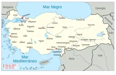 Las ciudades que superan el millón de habitantes son: en primer lugar, Estambul con 12 829 960 habitantes según estimación del año 2009; luego está la sede del gobierno, Ankara (la Ancira de la Antigüedad) con 4 306 105 hab. Luego están Esmirna (İzmir), Bursa, Adana y Gaziantep. Geográficamente, de acuerdo a la Organización político-administrativa de Turquía, este país está dividido en siete regiones: región del Egeo, región del Mar Negro, región de Anatolia Central, región de Anatolia Oriental, región del Mármara, región del Mediterráneo y Región de Anatolia Suroriental, las cuales se subdividen en ochenta y una provincias, administradas cada una de ellas por un gobernador designado por el Gobierno central.