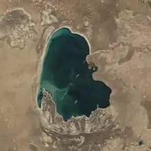 En Uzbekistán solo hay dos lagos naturales, uno de ellos son los restos del mar de Aral y el otro es el lago Sariqamish. El mar de Aral, alimentado por una cuenca de 1,549.000 km² y las aguas de los dos grandes ríos de la región, el Amu Daria y el Sir Daria, compartido con Kazajistán, se ha visto reducido a varios lagos pequeños que, en su parte meridional uzbeka ocupaban, en 2005, unos 3500 km², con una profundidad media de 14-15 m. Por otro lado, mientras la parte kazaja, alimentada por el río Sir Daria, ha tenido cierta recuperación en los últimos años con la construcción de un dique para formar el embalse de Korakal, que ha hecho revivir la ciudad de Aralsk, la parte uzbeka, centrada en la ciudad de Moynaq, se encuentra frente a un desierto gigantesco, ya que el río Amu Daria no posee suficiente agua después de regadío para alcanzar el mar de Aral.[7] El lago Sarygamisk, al sur del mar de Aral, está dividido entre Uzbekistán y Turkmenistán, en una depresión a medio camino del mar de Aral y el mar Caspio. Actualmente, está alimentado únicamente por un largo canal llamado Daryalyk Collector, que procede del río Amu Daria, después de que se secara el río Uzboy en el siglo XVIII. Históricamente, ha aparecido y desaparecido varias veces. Desde 1963, se ha convertido en el lago de drenaje de las aguas residuales del colector Daryalyk, que riega la orilla izquierda del Amu Daria. En Uzbekistán cubre unos 1000 km², en Turkmenistán unos 3000 km², con uno volumen de unos 60 km³ y una profundidad máxima de 45 m. Al norte y al oeste se encuentra la meseta de Ustyurt, que a pesar del nombre solo tiene unos 150 m de altitud.[8]
