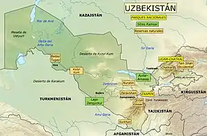 - Esta obra contiene una traducción derivada de «Géographie de l'Ouzbékistan» de Wikipedia en francés, publicada por sus editores bajo la Licencia de documentación libre de GNU y la Licencia Creative Commons Atribución-CompartirIgual 3.0 Unported.