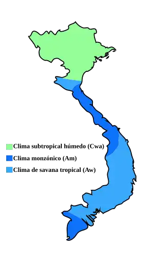 En Vietnam se pueden encontrar tres tipos de climas: el clima subtropical, en las regiones del norte y del interior; con inviernos secos y veranos húmedos. En las zonas central y suroriental predomina el clima monzónico, con altas temperaturas y precipitaciones muy abundantes. En el suroeste se dan dos estaciones bien diferenciadas, una húmeda y otra seca, aquí las temperaturas son más elevadas que en el norte. En Hanói (ciudad del norte del país) las temperaturas oscilan entre los 15 °C en enero y los 33 °C en julio, mientras que en Ciudad Ho Chi Minh (en el sur) las temperaturas oscilan entre los 21 °C en enero y los 30 °C en julio.