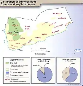Según World Population, en Yemen había, en 2019, 29 388 000 hab., con una densidad de 53,5 hab/Km². La población urbana era del 35,2 %, con un máximo en la capital, Sana, de 3 937 000 hab. Ciudades como Taiz, Al Hudayda y Aden tienen en torno a 500 000 habitantes. La mayor parte de los yemeníes es de origen árabe; no obstante, es una sociedad fuertemente tribal, con cerca de 400 tribus zaidinas o zaidíes en el norte y grupos de castas hereditarias en las zonas urbanas, sobre todo akhdam (sirvientes), confinados en los arrabales de las grandes ciudades. De 10 000 a 30 000 turcos viven en Yemen a raíz de la colonización otomana, y una amplia comunidad de judíos yemeníes. Hay también gente de Malasia, Indonesia y Singapur de ascendencia árabe.[15]