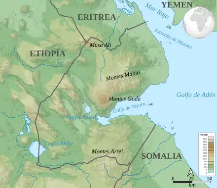 Las montañas al sur del golfo incluyen los montes Arrei, también llamados acantilado de Ali Sabieh, con una altura de 1.300 m, cerca de la frontera con Etiopía; el monte Dagouein, de 1.124 m, al este de los anteriores, y los montes Boura, que alcanzan 1.037 m y son tierra del clan somalí de los issa.