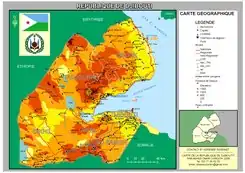 Un gran arco de montañas separa la llanura costera de una meseta interior. No hay cultivos permanentes por falta de tierras útiles y hay poca cubierta forestal. El escaso bosque está en los Montes Goda, especialmente en el Parque nacional del Bosque de Day. La mayor parte del país se usa como tierra de pastos permanentes y pertenece a la ecorregión de la pradera y matorral xerófilos de Etiopía, excepto por una franja a lo largo de la costa del Mar Rojo, que forma parte del desierto costero de Eritrea, que destaca como una importante ruta para aves de presa.[1]