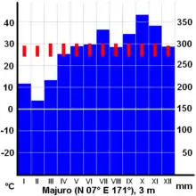 En la capital, Majuro, en un atolón de 64 islas que cubren solo 9,7 km² y una laguna de 250 km², al sur, caen unos 3355 mm anuales de precipitación, con un mínimo de 180 mm en febrero y un máximo de 360 mm en octubre. Las temperaturas, constantes todo el año, se mantienen entre los 25.oC de mínima y los 30.oC de máxima.