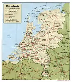 Los Países Bajos están divididos en doce provincias (provincies, singular - provincie): Holanda Meridional (cap. La Haya), Holanda Septentrional (Haarlem), Brabante Septentrional (Bolduque), Güeldres (Arnhem), Utrecht (Utrecht), Limburgo (Maastricht), Overijssel (Zwolle), Frisia (Leeuwarden), Groninga (Groninga), Drente (Assen), Zelanda (Midelburgo) y Flevoland (Lelystad).