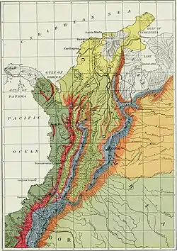 Colombia se encuentra en la placa Sudamericana rodeada por la placa de Nazca y Caribe. Los registros de movimientos tectónicos más antiguos se datan hasta el Jurásico, con la apertura del océano Atlántico como resultado de la ruptura de Pangea. La placa de Nazca se está moviendo hacia el este desde el Paleoceno, un movimiento que formó los Andes y las tres cordilleras de Colombia. Los movimientos en el límite de la placa del Caribe desde finales del Paleógeno y que fue responsable de la formación de la Sierra Nevada de Santa Marta. Los movimientos tectónicos del Cretácico tardío hasta la actualidad condujeron a una elevación media de 2,7-2,8 mm/año, en tres etapas. Una fase tranquila llevada a cabo desde el Cretácico superior al Eoceno temprano (de 0,5 a 3,1 mm/año), seguido de un rápido movimiento en el medio-Eoceno tardío (4-18 mm/a) formó aproximadamente el 86% de la actual Cordillera Oriental. Esta última fase, más lenta (1,2-2,1 mm/a), se llevó a cabo desde el Oligoceno al Holoceno.[1]