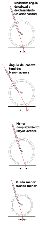 Al aumentar la longitud de la horquilla, por ejemplo al cambiar de una rígida a una con suspensión, se levanta la parte delantera de la bicicleta y se disminuye el ángulo del cabezal.[10] Alargar la horquilla tendría el efecto opuesto en el lanzamiento de una motocicleta, ya que la inclinación se mide en la dirección opuesta.