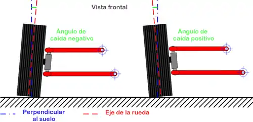 El ángulo de caída es el formado entre la rueda y el plano perpendicular al suelo según el eje longitudinal del vehículo. Se suele medir en grados y minutos.
