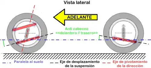Este término hace referencia a los ángulos de los brazos de suspensión (delantero y traseros) en el sentido longitudinal del bastidor respecto al plano paralelo al suelo. Se miden en grados.