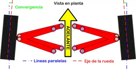 En las configuraciones habituales, el tren delantero y el posterior suelen converger con el fin de estabilizar la trayectoria del vehículo en recta.