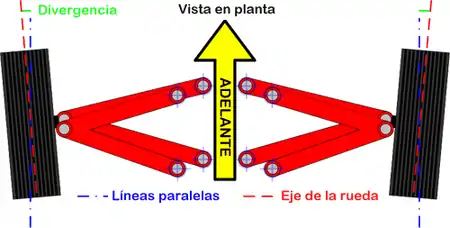 Se dice que hay «divergencia» cuando los planos de las ruedas extendidos se cruzan por detrás del tren de ruedas estudiado. También se mide en grados y minutos.