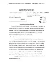 - «Statement of Facts of Guilt». United States v. George Papadopoulos (en inglés). Departamento de Justicia de los Estados Unidos. 5 de octubre de 2017.