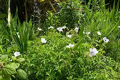 Se trata de una herbácea perennifolia que crece hasta los 50 cm de altura, con hojas profundamente cortadas con 7 lóbulos y flores blancas o moradas, con vetas de color rosa y que se producen en verano. Se propaga con rizomas subterráneos y se utiliza para la cubierta vegetal o la parte delantera de una valla.[3]