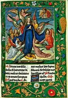 - Breviario para uso de Windesheim(ca. 1487), Biblioteca John Rylands, Mánchester, Ms. 39. Probablemente ejecutado en Gante,[18] consta de 265 hojas bastante pequeñas, el texto es de 179 × 120 mm, con doce miniaturas en páginas de dos columnas, y dieciocho miniaturas en páginas de una columna. El breviario contiene, entre otras cosas, una Asunción de la Virgen en la que los ángeles llevan a la Virgen sobre su tumba decorada con tres hostias eucarísticas.[18][19][20][21]