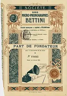 Certificado de la Soc. des Micro-Phonographes Bettini, edición 2. Febrero 1901